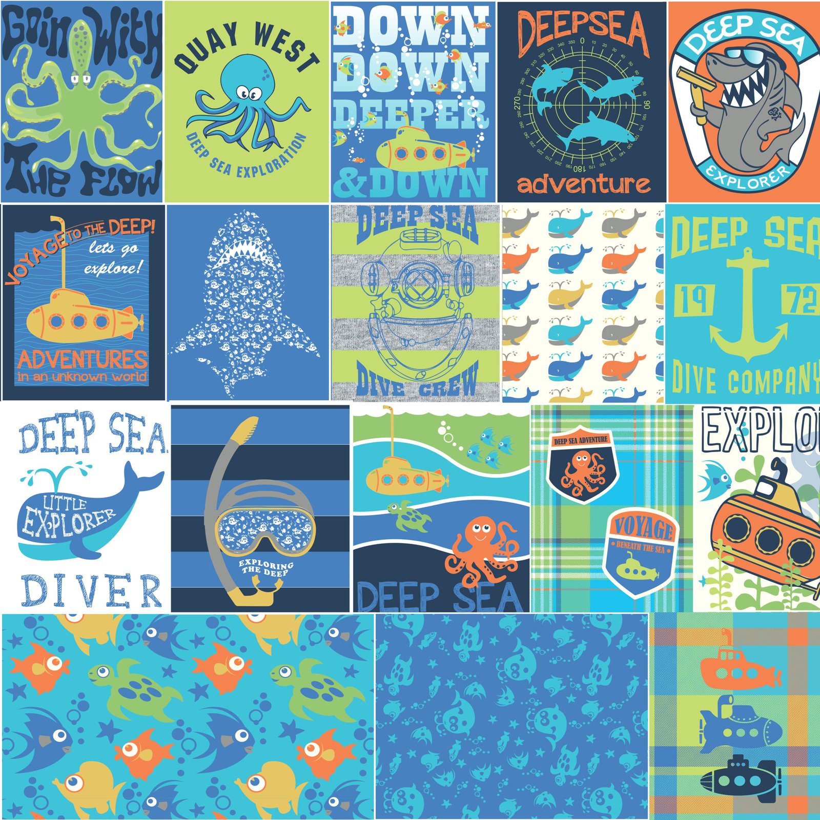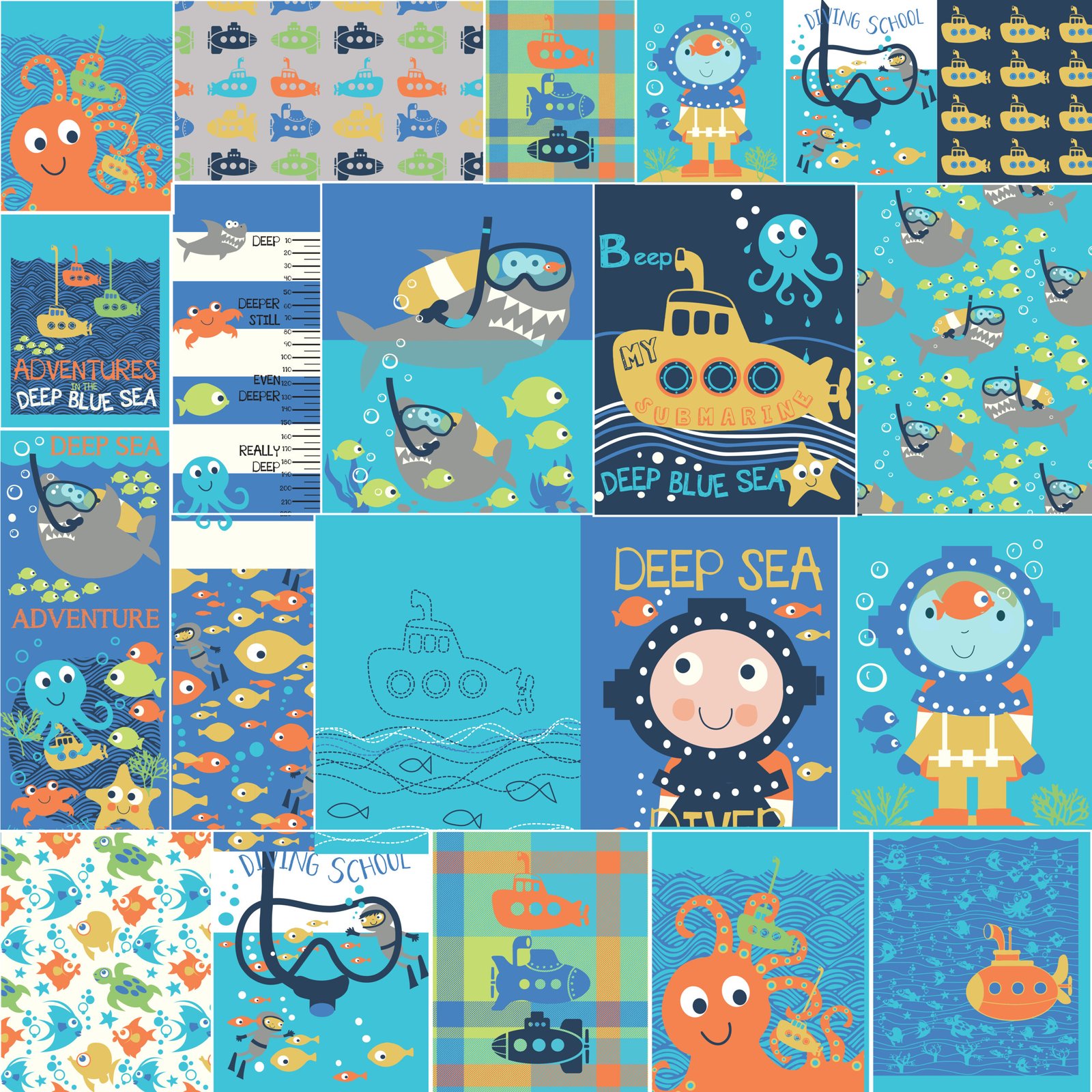 Each illustration within the Kids Ocean Submarine & Diving Vector Pack is optimized for Adobe Illustrator users, allowing smooth integration with textile mockups, pattern templates, or print layouts.