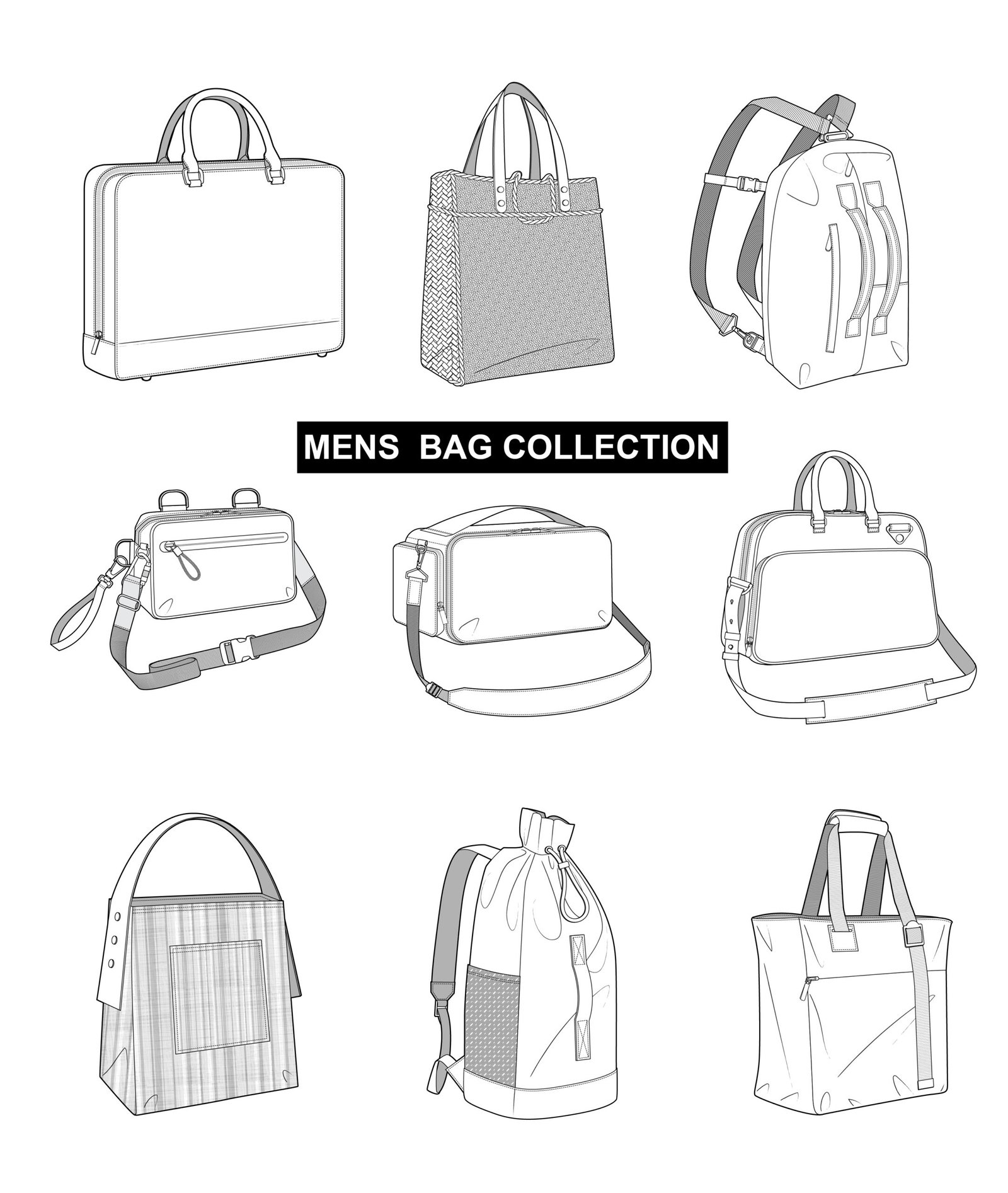 Stylish and detailed Men’s Bag Vector Collection, featuring backpacks, messenger bags, duffel bags, and more — fully editable in Adobe Illustrator (AI). Perfect for fashion designers, graphic artists, vector designers, and fashion illustrators creating catalogs, branding visuals, or digital mockups.