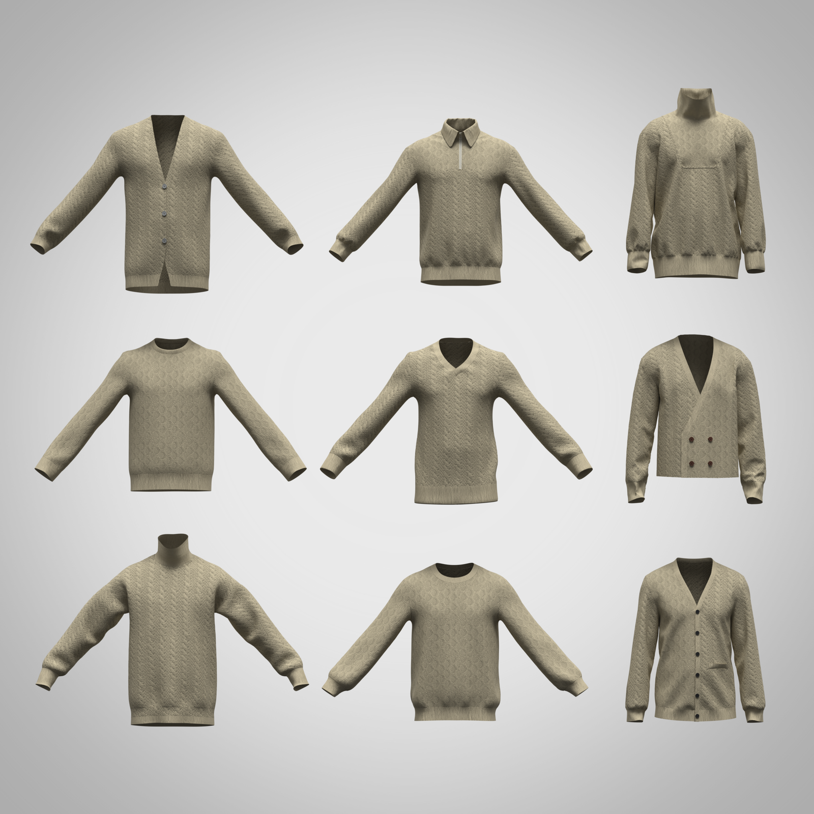 Ultimate featuring 9 high-quality sweater 3d mockup garments designed for professional digital fashion workflows. This collection includes v-neck, crew neck, roll neck, quater zip and cardigan modern tailored variations built specifically for CLO3D and Marvelous Designer simulation. Each garment is constructed with clean internal patterns, accurate collar and placket detailing, realistic sleeve structure, and balanced volume for natural draping behavior. Designs include multiple collar types, pocket placements, pattern variations, and contemporary menswear fits to cover both casual and formal categories. Files are fully editable and suitable for customization, rendering, fabric replacement, and virtual sampling pipelines. Compatible with CLO3D, Marvelous Designer, Blender, and Substance Painter for advanced texturing and visualization workflows. Ideal for menswear designers, 3D fashion artists, apparel developers, e-commerce visualization teams, and digital garment studios looking to accelerate shirt development without building patterns from scratch. If anything is missing just direct text me, I will be there for help. File formats: ZPRJ, OBJ, FBX, MTL, LXO, GLTF and also all in one file – zip file is attached. Made with CLO Standalone.