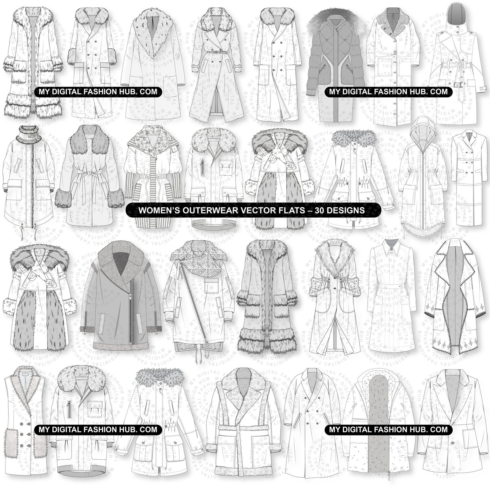 Womens winter outerwear vector flats are professional design resources built to support ideation, refinement, and clear visual communication—not shortcuts to manufacturing.