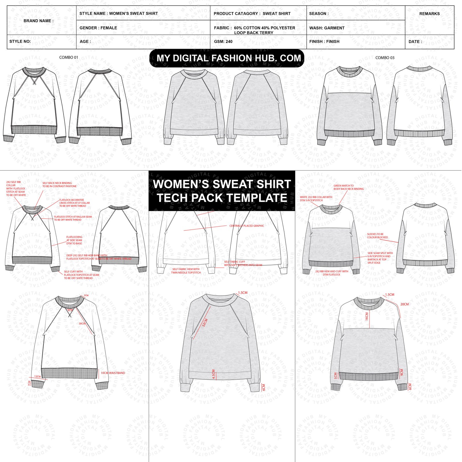 A tech pack (short for technical package) is the essential blueprint that bridges creative design and manufacturing. Without it, costly communication errors can occur during sampling or bulk production. The women’s sweatshirts tech pack eliminates those gaps — offering clear technical drawings, measurement charts, fabric details, and trim information in a structured layout.